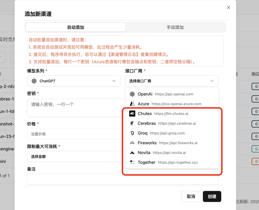 注意:我们强烈推荐使用平台提供的【渠道自动添加】功能,不同模型厂商的模型命名均有差异,Poixe AI系统层面做了一层映射,管理页面仅显示映射后的模型。建议使用自动添加功能。